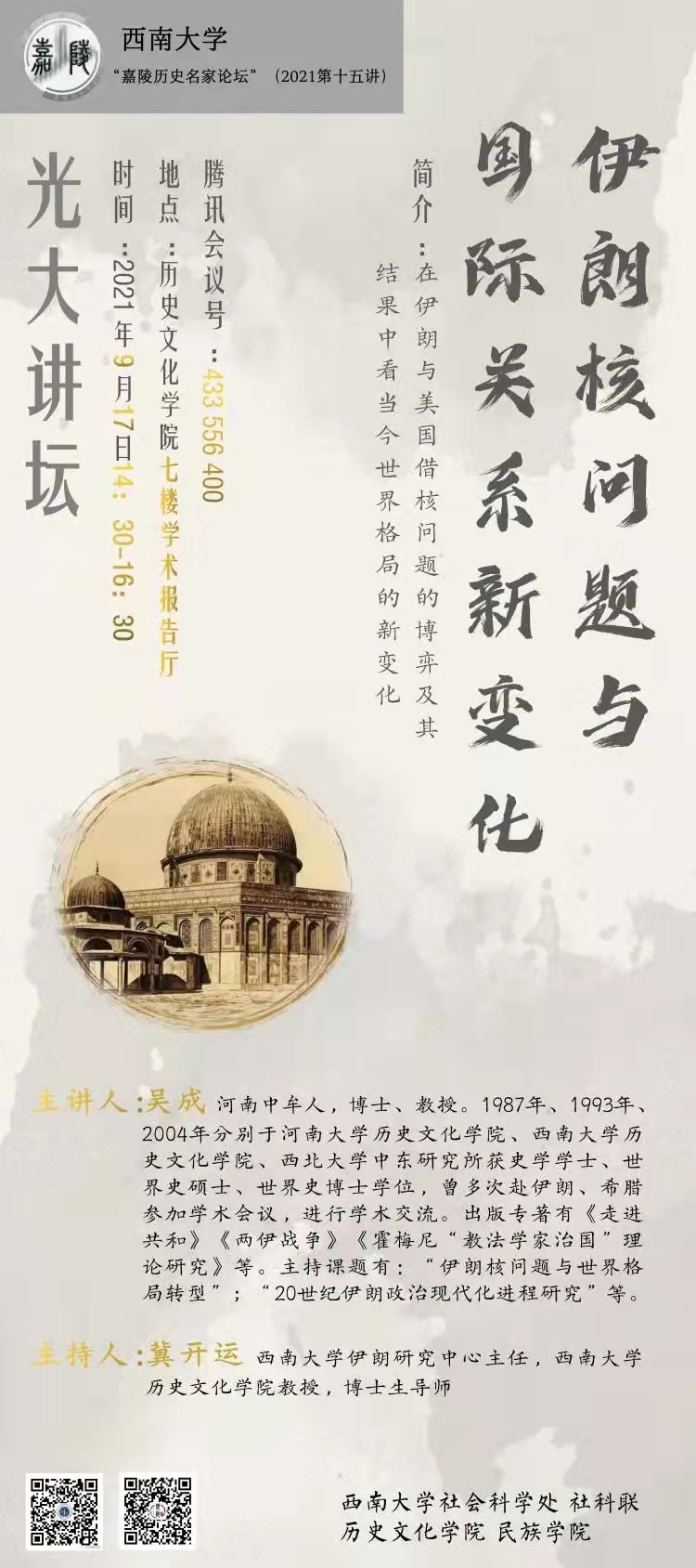主讲人:吴成,河南中牟人,博士、教授。1987年、1993年、2004年分别于河南大学k1体育、k1体育、西北大学中东研究所获史学学士、世界史硕士、世界史博士学位,现工作于河南师范大学马克思主义公司,曾多次赴伊朗、希腊参加学术会议,进行学术交流。2007年6月,在德黑兰与伊朗前总统哈塔米同台主持霍梅尼思想研讨会开幕式,并作《用人生圣火点亮共和之灯》的主题发言,受到与会者好评。出版专著有《社会思潮研究》《走进共和》《两伊战争》《教法学家治国》《霍梅尼“教法学家治国”理论研究》《社会主义核心价值与当代中国社会思潮》《伊朗核问题与世界格局转型》《巴列维王朝的最后400天》。